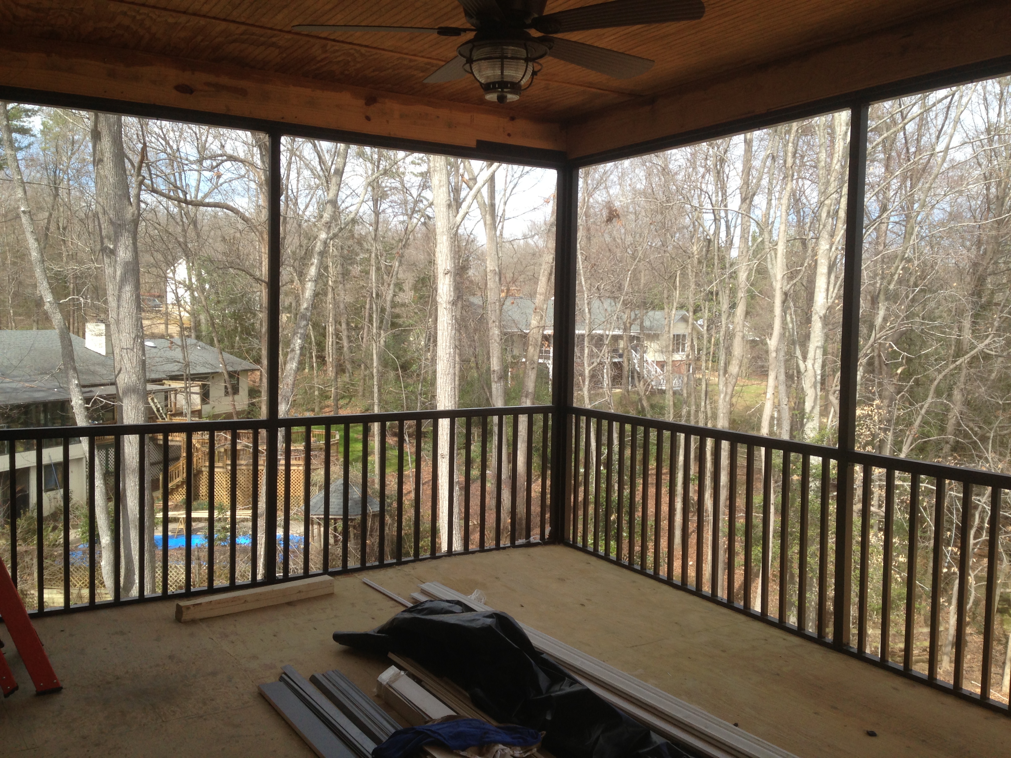 Deck with screened porch, bead board ceilings, and aluminum pickets.