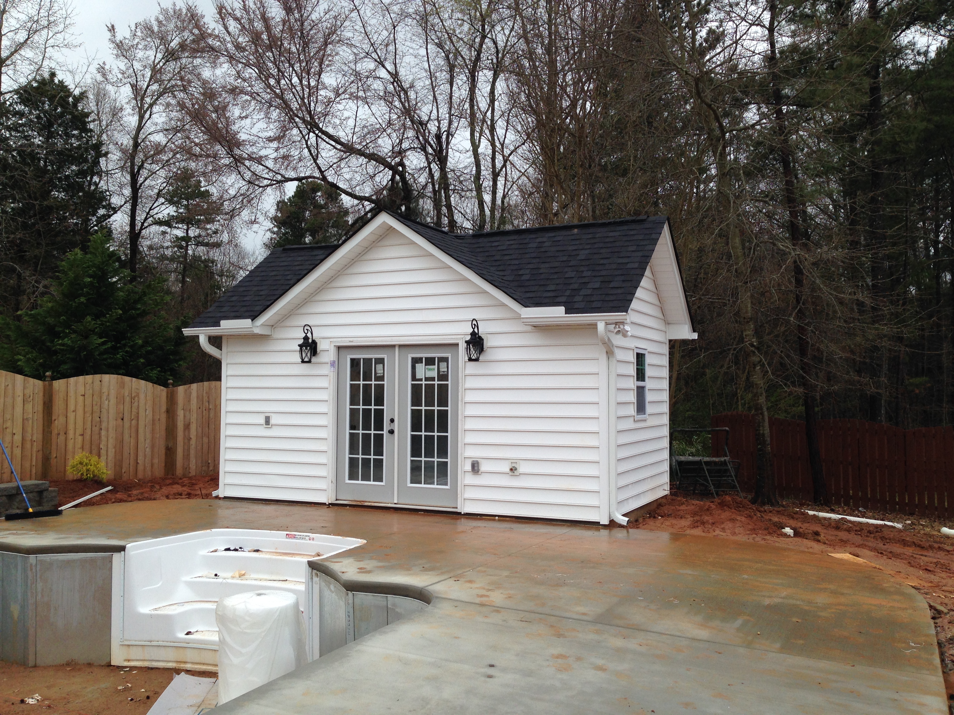 10×18 pool house with vinyl siding and full glass french door and 3’x5′ windows. Separate bathroom, pump room, and attic storage area inside.
